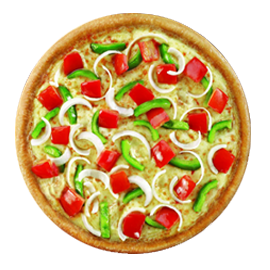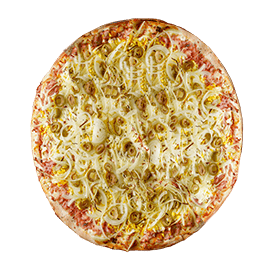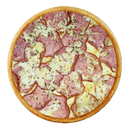 Molho de tomate, muçarela, presunto, tomate, cebola e oregano.