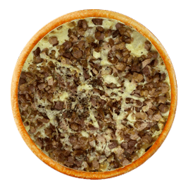 Molho de tomate, muçarela, file bovino, cebola e oregano.
