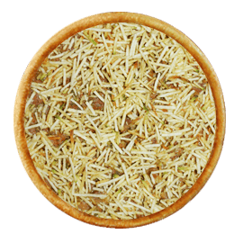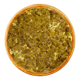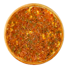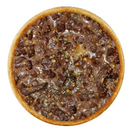 Molho de tomate, muçarela, carne bovina, batata palha e oregano.