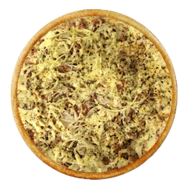 Molho de tomate, muçarela, frango desfiado, bacon, batata palha, cheddar e oregano.